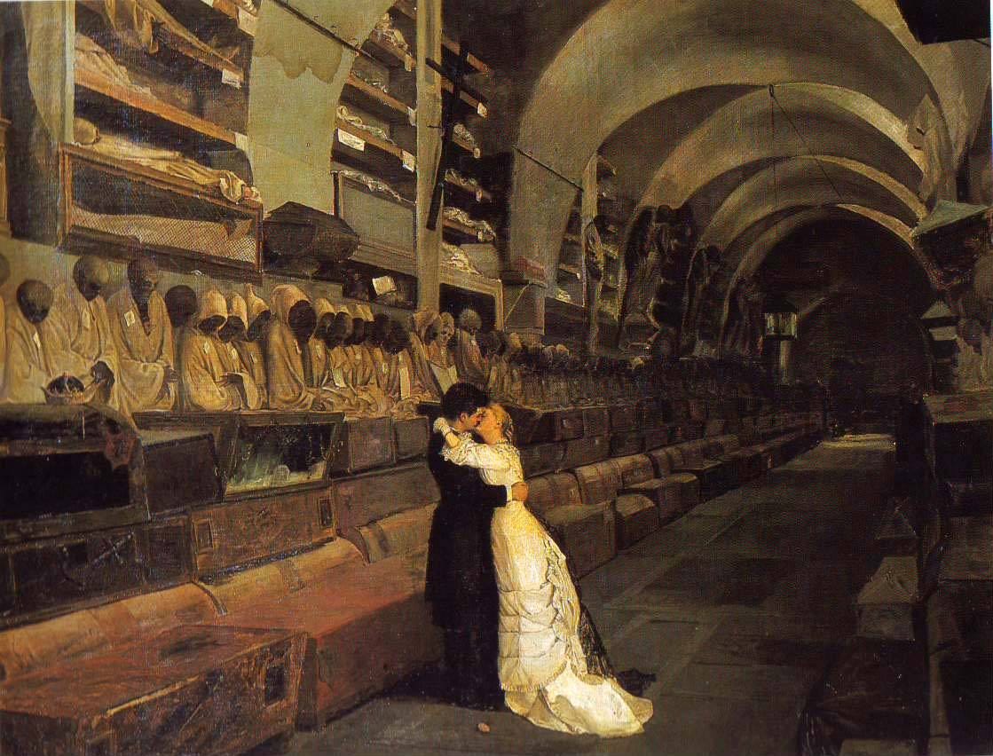 Fabrizio jokingly wishes his body could be placed in the Capuchin Catacombs like in olden times. This is an actual place (and tourist attraction) in Palermo where, starting from the 1600s, mummies were placed in rows, sitting or even standing up, dressed in their sunday best and waiting for their living relatives to visit. Yes, this is a thing people chose for themselves. The mummies are around 8.000, there are mostly monks but also soldiers in uniform, girls in wedding dresses, plenty of children. I’ve added a painting but DO NOT look for actual pictures if you’re faint of heart.
